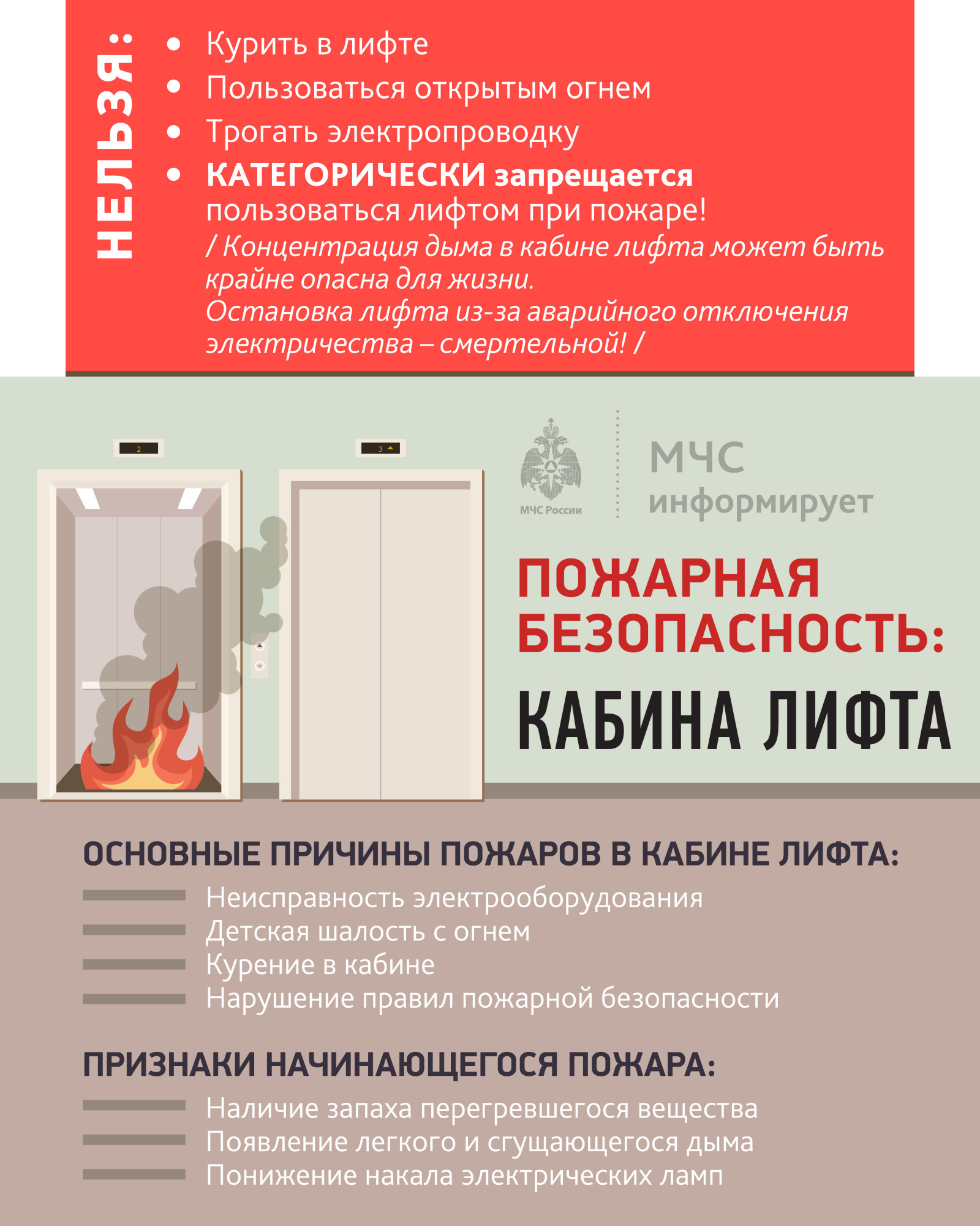 Запомните одно главное правило: в любой аварийной ситуации (пожар, землетрясение, потоп, запах гари или сильного дыма) пользоваться лифтом ЗАПРЕЩЕНО.
