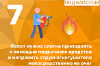 Под капотом. Осторожно приоткройте капот с помощью палки или монтировки (из‑за риска выброса пламени). Направьте струю огнетушителя на самый интенсивный очаг. Если огнетушителя нет, попробуйте накрыть пламя брезентом или забросать песком, снегом, землёй. Если потушить огонь быстро не получается, отойдите на безопасное расстояние.