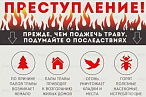 Ежегодно с наступлением весенне-летнего периода осложняется обстановка с пожарами. Как правило, в это время происходит несанкционированное сжигание сухой травы, мусора, нередко возникают лесные пожары. Часто из-за таких пожаров происходят возгорания хозяйственных построек и жилых домов граждан.