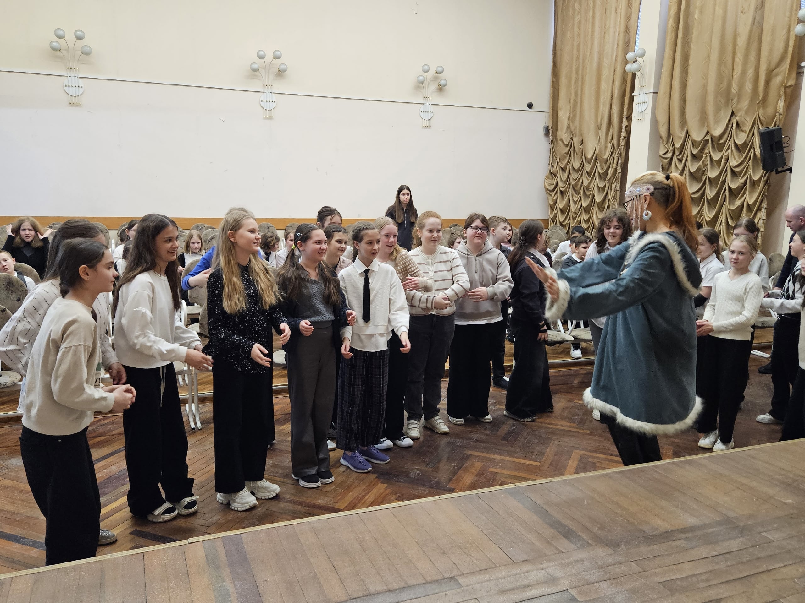 Под чутким руководством нашей гостьи ребята попробовали повторить пластику народного танца. Кто-то освоил «подпрыгивающий» шаг оленевода, кто-то попытался передать характер белого медведя в движении. Школьники с энтузиазмом включились в процесс: сначала смущенно, а затем все более уверенно они отбивали ритм и учились слушать музыку Севера.