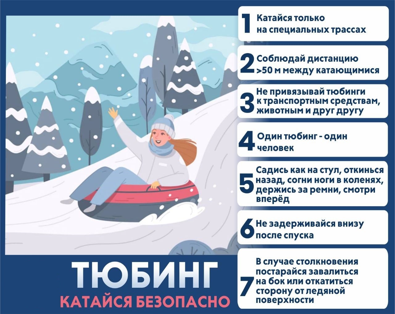 Вопреки привычному мнению, ставшее популярным катание на ватрушках (или тюбинг) может быть опасным и непредсказуемым видом отдыха. В отличие от санок, ватрушки способны развивать большую скорость и даже закручиваться вокруг своей оси во время спуска, являясь при этом практически неуправляемыми. Чтобы подобное развлечение приносило только положительные эмоции, необходимо соблюдать ряд правил: