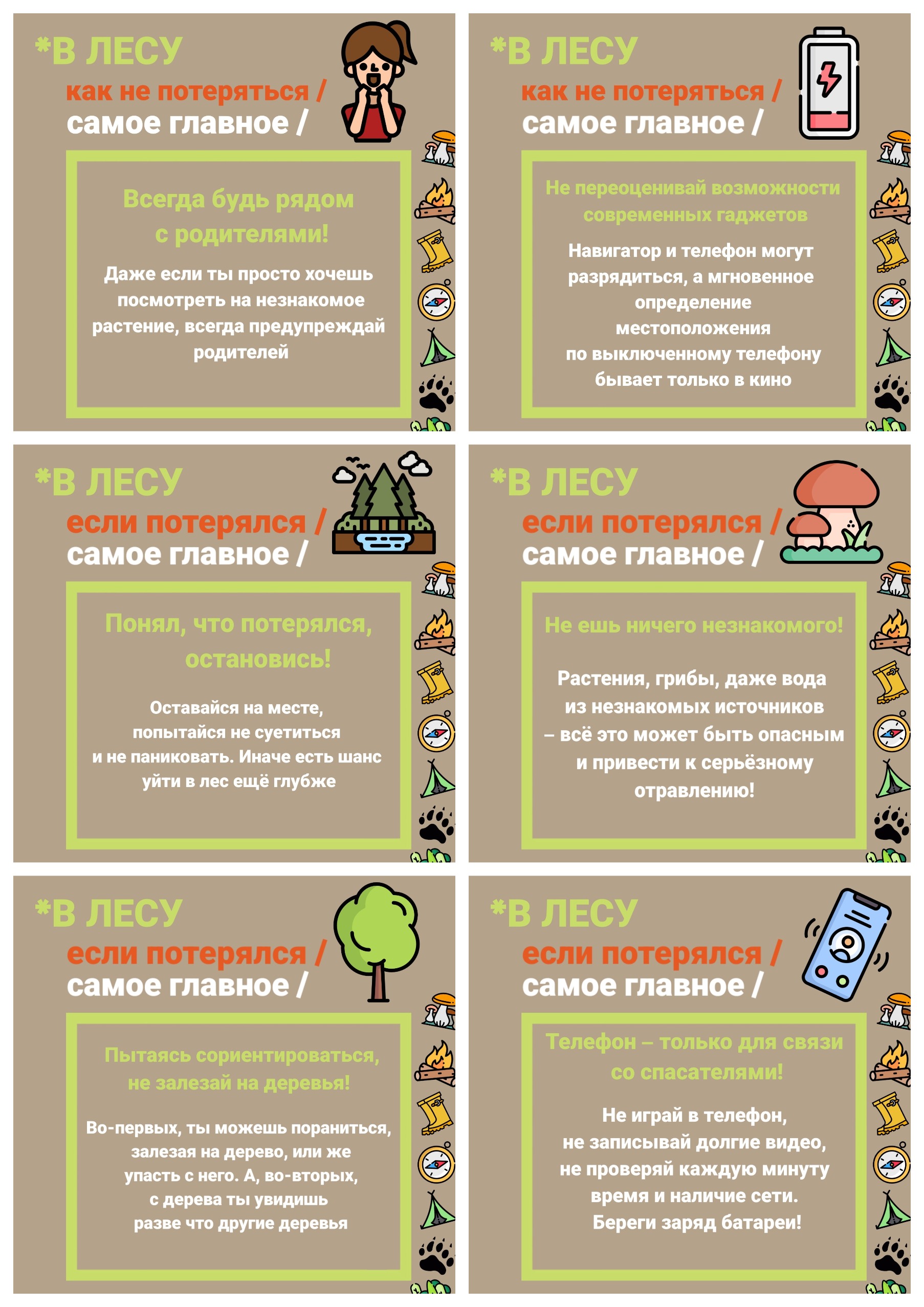 Перед тем, как отправится в лес, обязательно предупредите родных или друзей о том, куда вы собираетесь ехать или идти. Одеться лучше всего в яркую одежду и по погоде. Обязательно возьмите с собой заряженный мобильный телефон и наденьте на шею свисток.