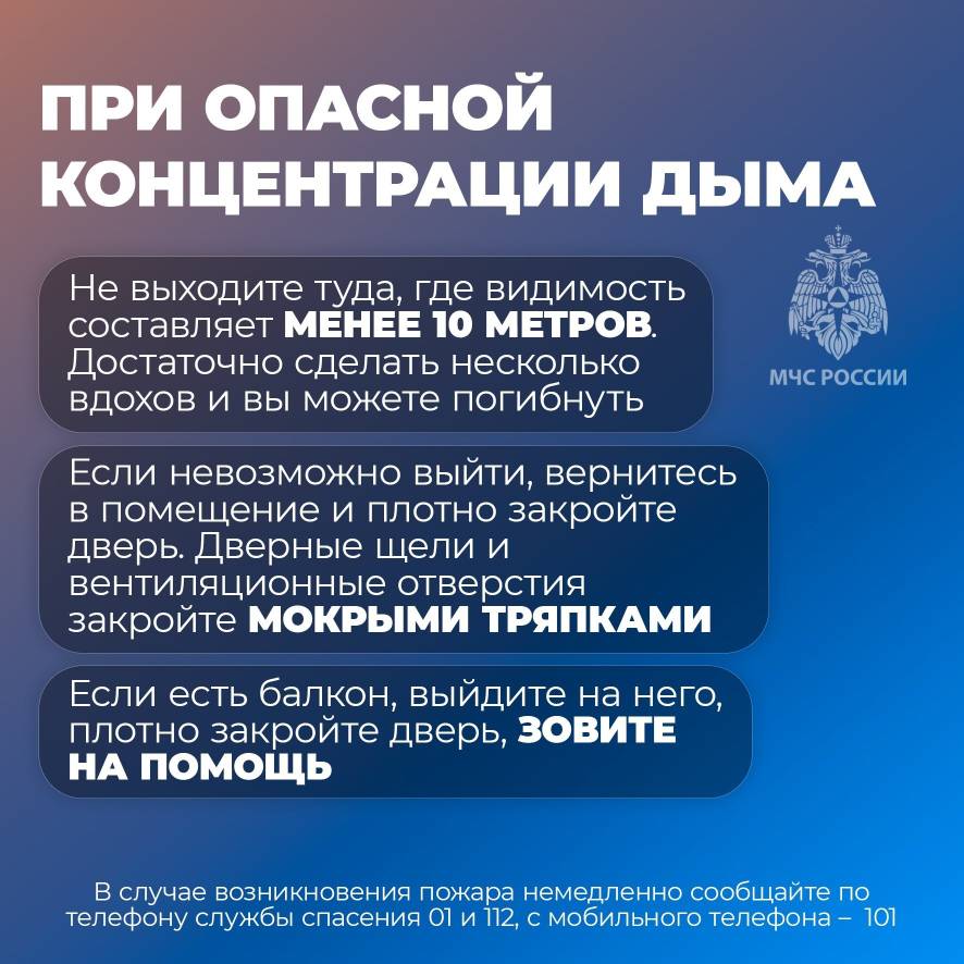 -При сильном задымлении защитите дыхательные пути: намочите ткань водой и дышите через неё. Это снизит риск отравления угарным газом и ожога дыхательных путей.
