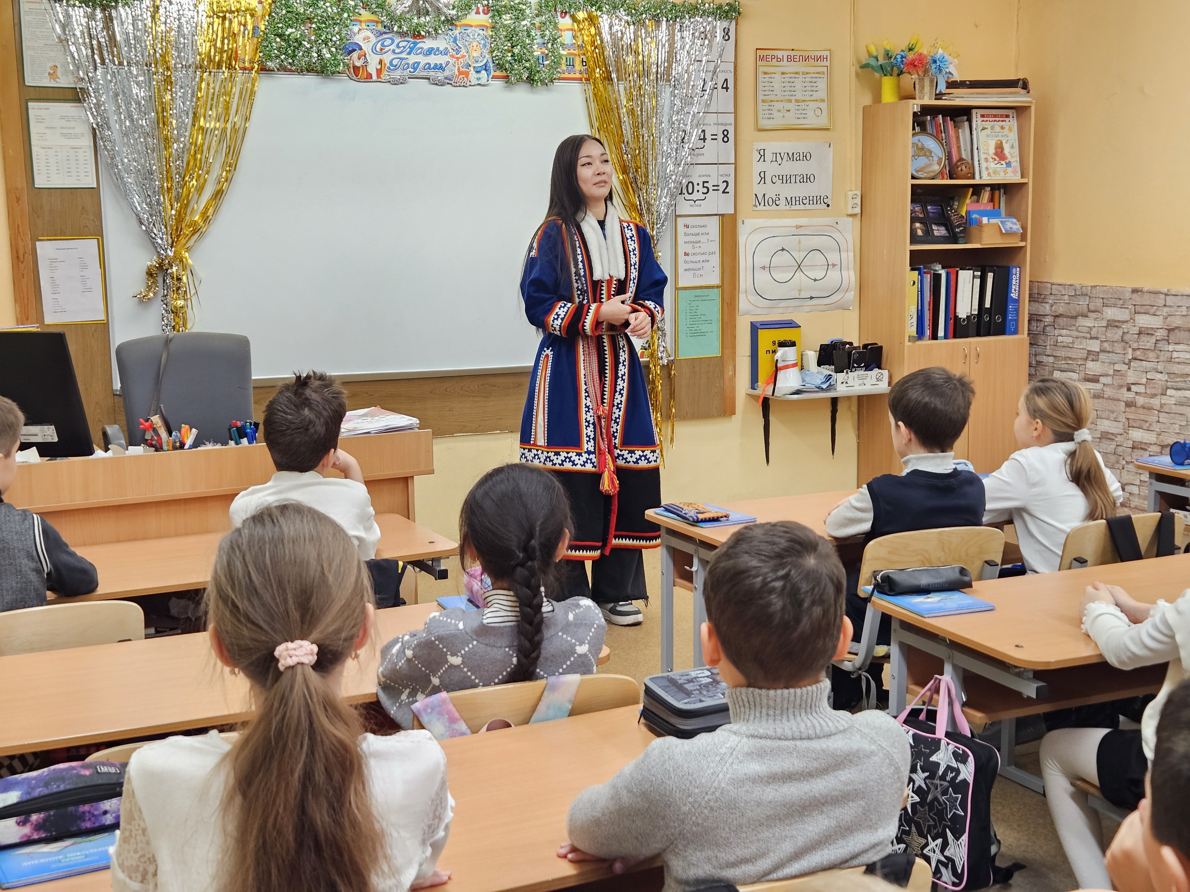 Гостьей встречи стала представительница Ямало-Ненецкого автономного округа, активистка Ямальского землячества Санкт-Петербурга Эля Алиахунова. В своём выступлении она подробно рассказала школьникам о культуре и традициях народов Ямала, уделив особое внимание новогодним и зимним обычаям региона.