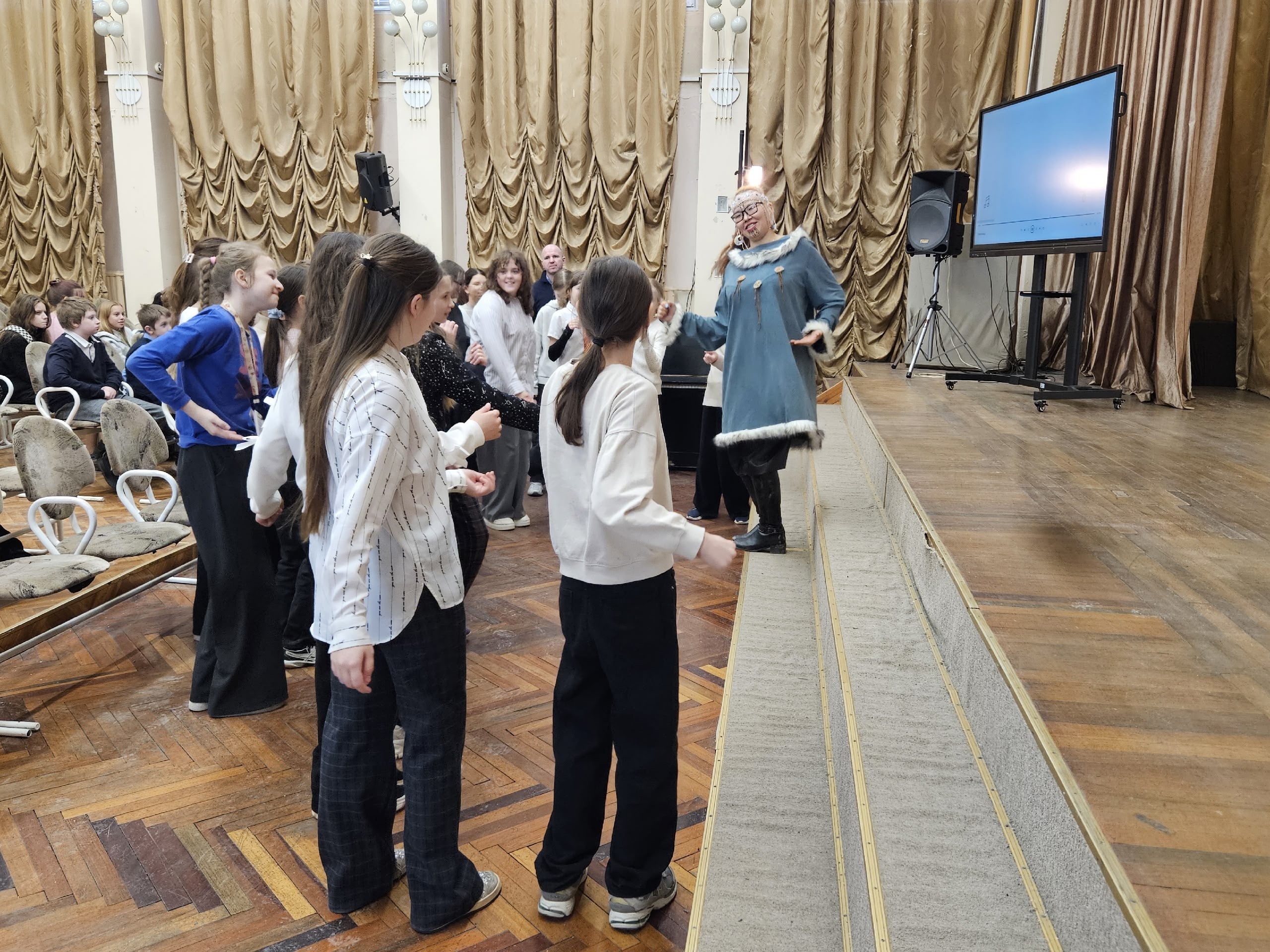 Под чутким руководством нашей гостьи ребята попробовали повторить пластику народного танца. Кто-то освоил «подпрыгивающий» шаг оленевода, кто-то попытался передать характер белого медведя в движении. Школьники с энтузиазмом включились в процесс: сначала смущенно, а затем все более уверенно они отбивали ритм и учились слушать музыку Севера.