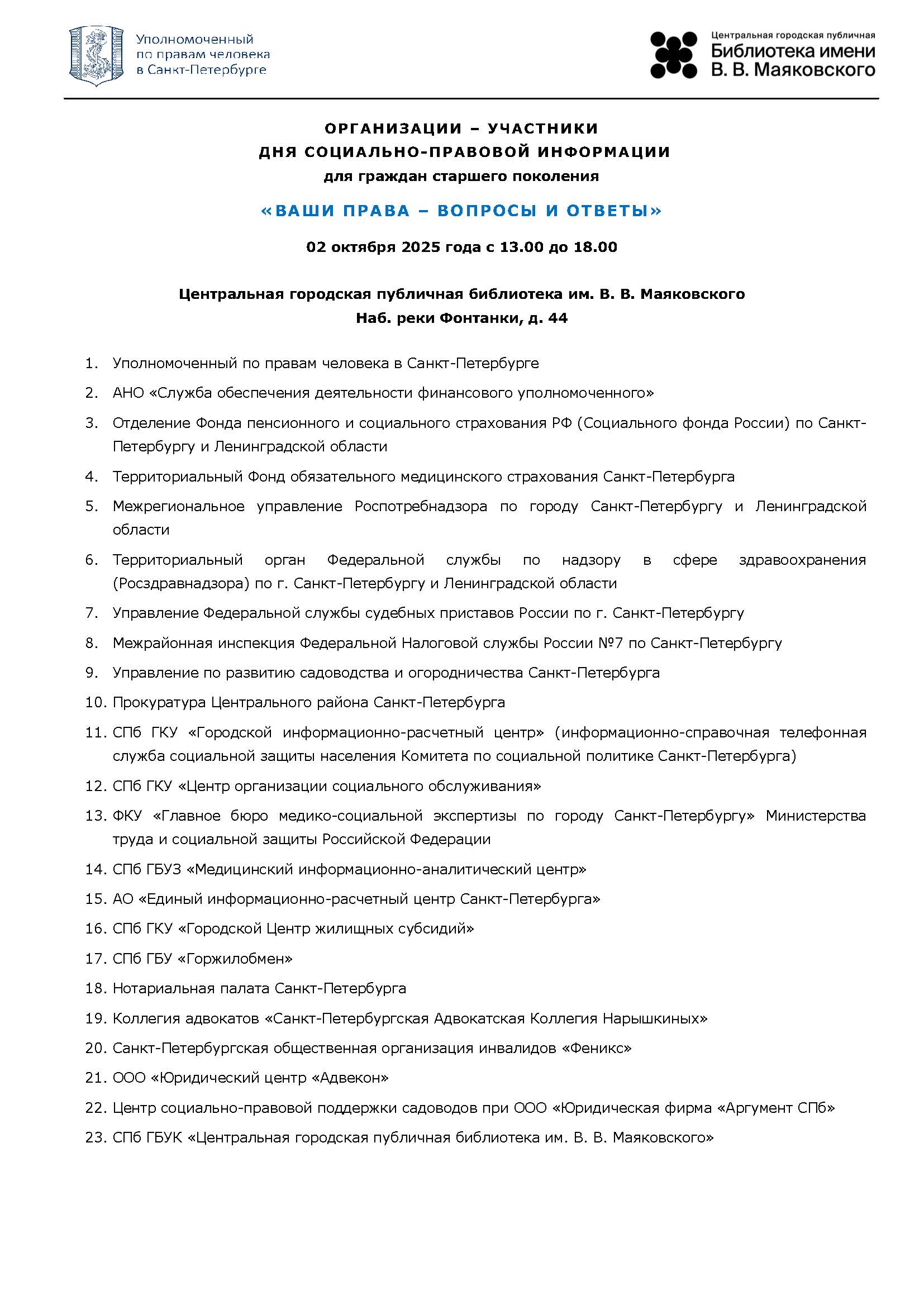 В этот день Уполномоченный по правам человека в Санкт-Петербурге совместно с Центральной городской публичной библиотекой им. В. В. Маяковского приглашают петербуржцев старшего поколения посетить мероприятие и получить индивидуальные консультации у специалистов и юристов.