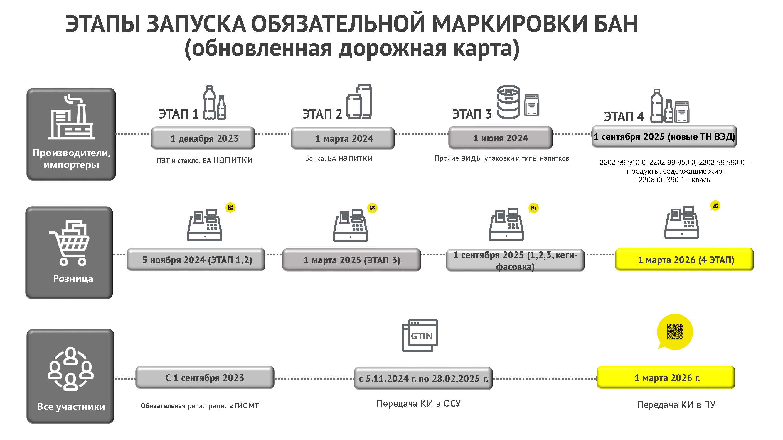 1.       Этапность введения обязательных требований по маркировке средствами идентификации безалкогольных напитков и соков (обновленная дорожная карта).