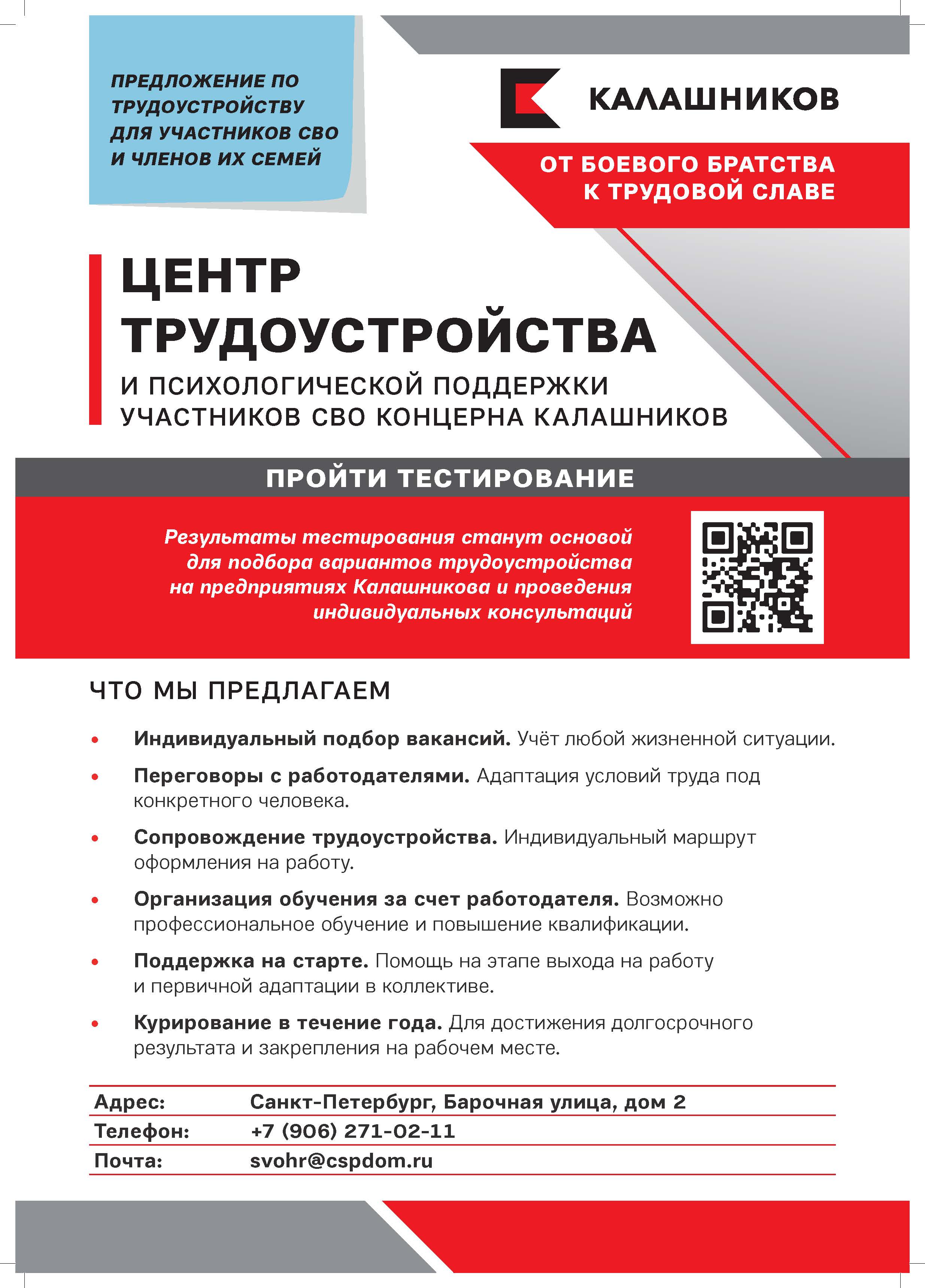 Центр трудоустройства и психологической поддержки Концерна Калашников приглашает участников СВО и членов их семей для прохождения онлайн тестиро-вания (http://www.cspdom.ru/ofer.php), подбора вакансий и трудоустройства. При необходимости возможно обучение (повышение квалификации, получение рабо-чей специальности и т.д.) за счет работодателя, а также психологическая поддержка каждому обратившемуся.