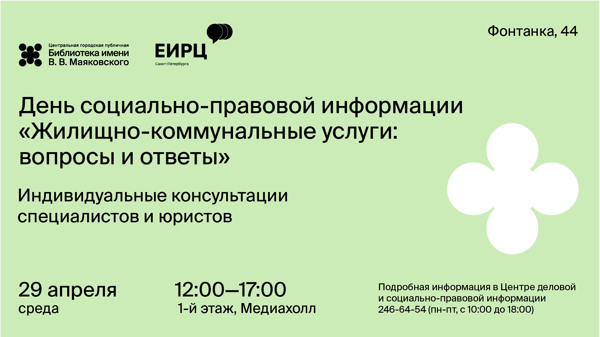 В этот день Единый информационно-расчетный центр Санкт-Петербурга совместно с Центральной городской публичной библиотекой им. В. В. Маяковского приглашают петербуржцев посетить мероприятие и получить индивидуальные консультации у специалистов расчетного центра, поставщиков услуг и юристов.