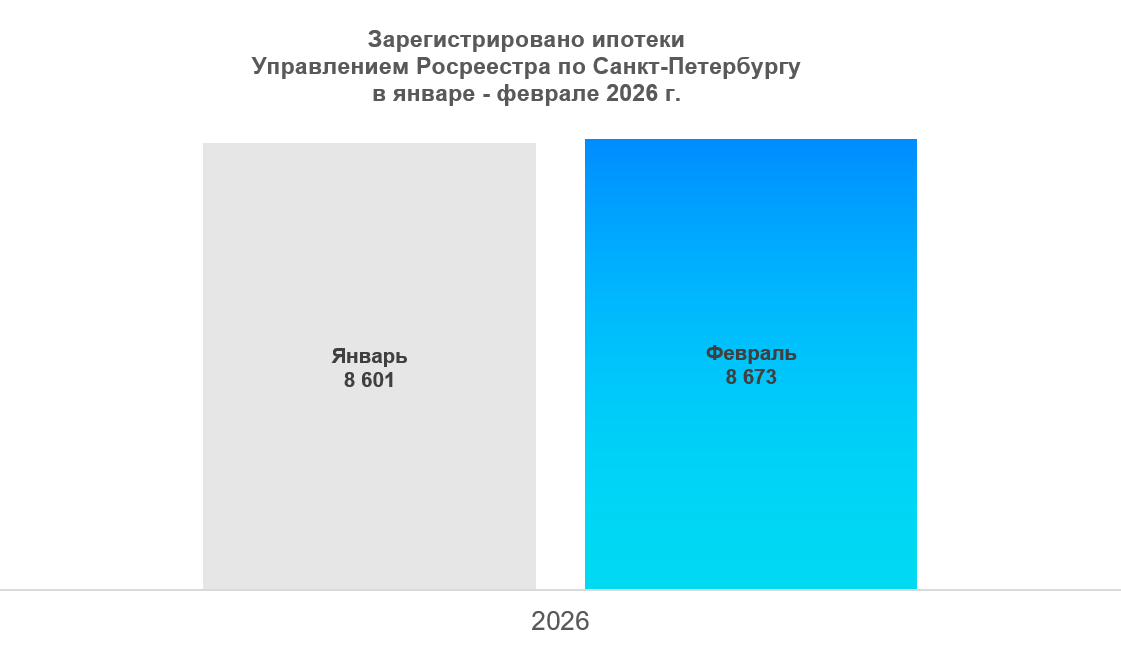 В феврале 2026 года зарегистрировано ипотеки 8 673 (в январе 2026 года – 8601).