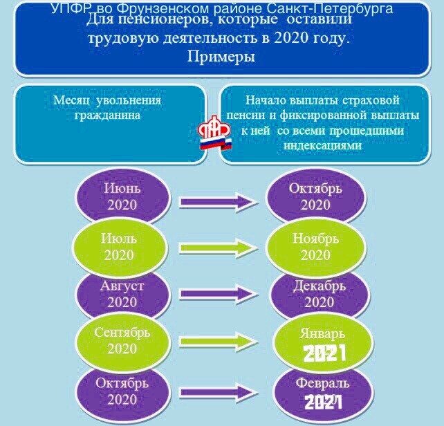 Например, пенсионер уволился 21 сентября 2020 года. В октябре в ПФР поступила отчетность от работодателя за сентябрь, в которой пенсионер еще числился работающим (т.к. часть сентября он отработал). О том, что гражданин уже не работает, стало известно из отчета работодателя за октябрь - его работодатель представил в ноябре 2020 года. В декабре орган ПФР принял решение о выплате пенсии с учетом всех пропущенных индексаций, и в январе 2021 года пенсионер получит уже полный размер пенсии, а также денежную разницу за предыдущие три месяца - октябрь, ноябрь, декабрь 2020 года.